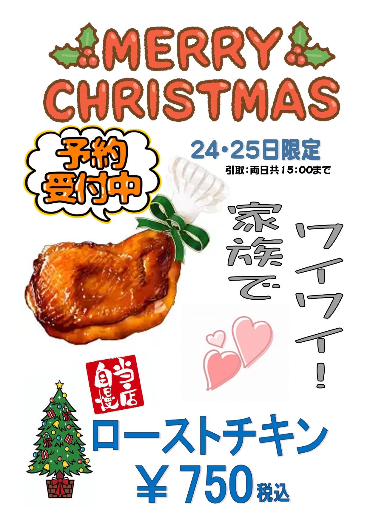 2025.12.18 クリスマス・チキン 予約受付中 電話での受付中です。平日13:00迄・土日21:00迄 049-222-1101 Tweet Share Pocket RSS feedly 2025年末年始の営業日のご案内
